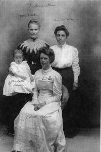 This collection brings together group photographs spanning multiple generations of the Adams family. These images document large family gatherings, multi-generational portraits, and earlier family groupings that help illustrate continuity, kinship, and shared history over time.